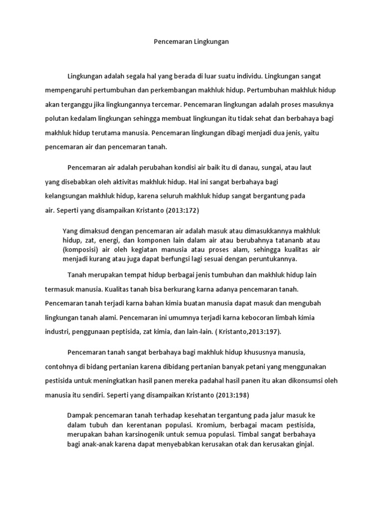 Jika dahulu sungai mampu mengalirkan sejumlah air yang banyak dalam sesuatu masa kini pengaliran telah. Pencemaran air dan tanah adalah pencemaran yang terjadi di perairan seperti sungai kali danau laut air tanah dan sebagainya. Di dunia pendidikan tulisan singkat ini dipergunakan oleh sebuah lembaga atau institusi sebagai informasi pertama pada suatu penelitian ketika akan di publikasi di jurnal seminar lokakarya dan yang.
